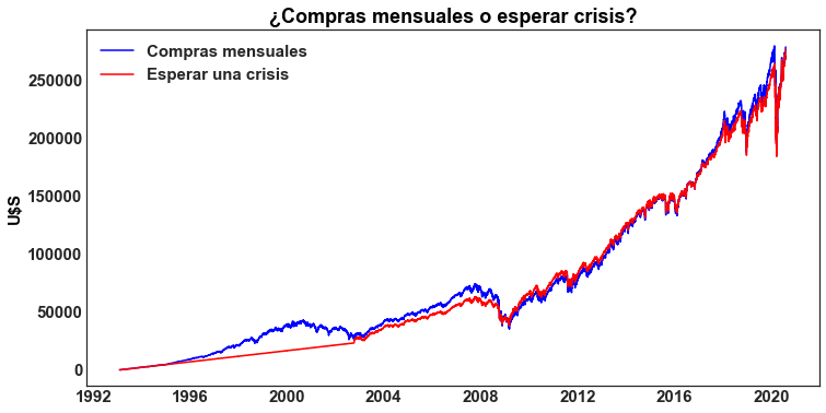 Imaginemos un inversor que ahorra USD 200 mensuales y debe elegir entre comprar todos los meses o guardarlos para comprar una vez que llegue alguna crisis importante. Vamos a darle a este inversor la fantasía de todo trader: es capaz de identificar con precisión exacta el mínimo del mercado.