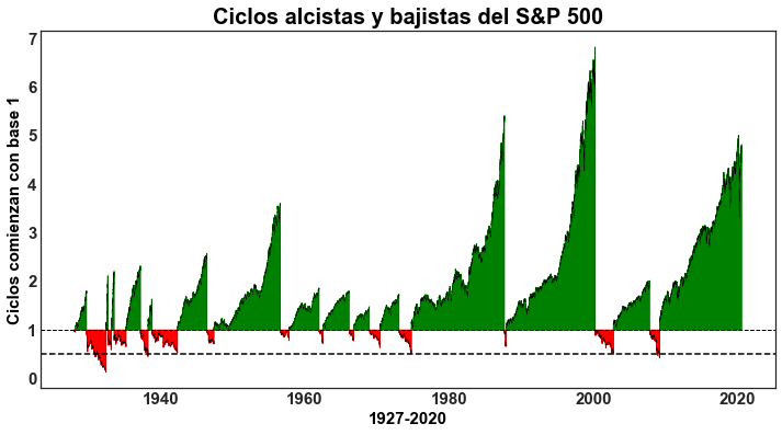 Vamos a considerar como ciclos bajistas a las caídas mayores al 20% que duraron más de 60 días antes de iniciar la recuperación. Con este criterio el bear market promedio dura un año y medio e implica una pérdida de 41,8%.