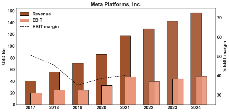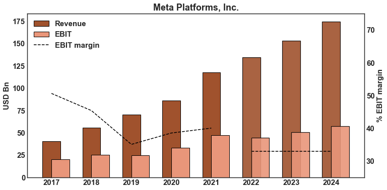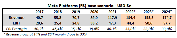 The company reaches USD 57,7 Bn in EBIT for 2024. A less hostile sentiment allows Meta to trade at 16x EV/EBIT. In this scenario, the stock could achieve a 25% CAGR.